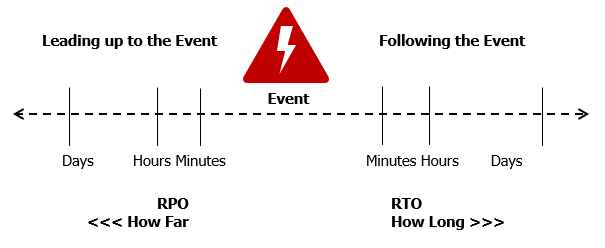 - Recovery Point Objective (RPO) – Point in the past to which you will recover from (maximum amount of data that can be lost based on the time between your last back-up and the unplanned outage.) Essentially, RPO is about how much data can be lost before it seriously impacts the organization.